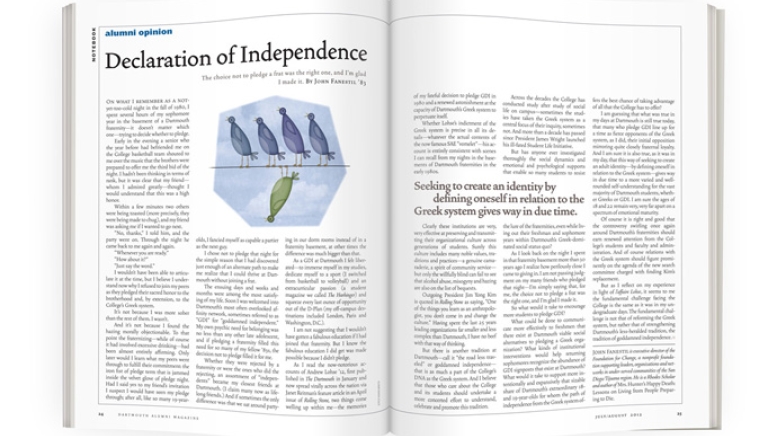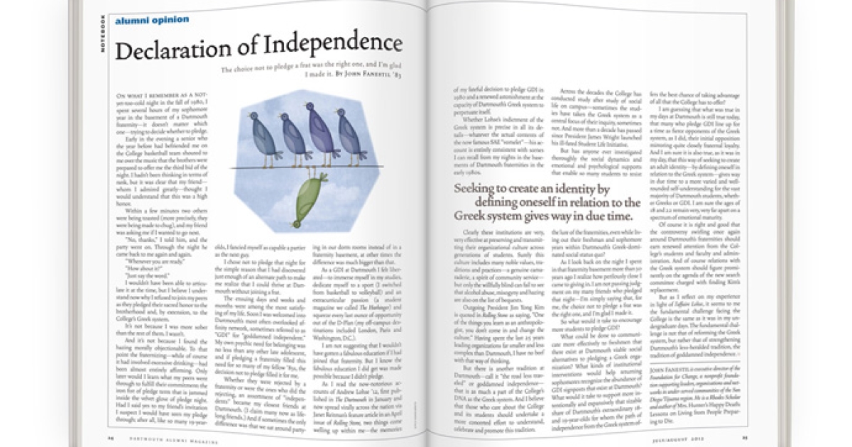 But there is another tradition at Dartmouth—call it “the road less traveled” or goddamned independence—that is as much a part of the College’s DNA as the Greek system. And I believe that those who care about the College and its students should undertake a more concerted effort to understand, celebrate and promote this tradition.