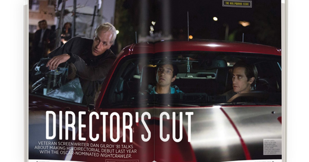 Screenwriter Dan Gilroy, best known for films such as Two for the Money (2005), Real Steel (2011) and The Bourne Legacy (2012), made his directorial debut in 2014—at age 55—helming his script Nightcrawler to critical acclaim. The film, a gritty tale starring Jake Gyllenhaal and shot mostly on the streets of Los Angeles, earned him his first Oscar nomination for best original screenplay. The film costars Gilroy’s wife, Rene Russo, and was edited by his twin brother, John ’81, and produced by his older brother, Tony. Here the son of Pulitzer- and Tony Award-winning playwright Frank Gilroy ’50 talks about his “very personal” project—and what he learned from his dad.