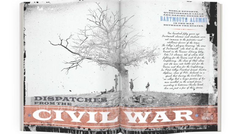 The College’s plaque honoring “the sons of Dartmouth” who died in the war, housed in the Rauner Library lobby, lists 73 alumni, 63 of whom died fighting for the Union and 10 for the Confederacy. The class of 1863 alone sent 56 men into battle—53 for the Union and three for the Confederacy.
