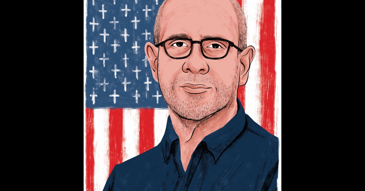 Sharlet logged onto Zoom from his MacBook. His reflection stared back at him: a bald guy in his early 50s with salt-and-pepper stubble on his chin, wearing horn-rimmed tortoiseshell glasses. Sharlet, who lives in Norwich, Vermont, with his wife and two kids, has been a professor of creative writing at Dartmouth since 2010. He’s been immersing himself in the world of the religious right, for magazines such as Harper’s, GQ, and Vanity Fair, for two decades, and he has covered Trumpism as a kind of death cult, an apocalyptic faith whose adherents believe themselves to be engaged in spiritual warfare.