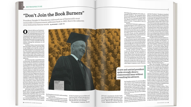 On June 14, 1953, as our Commencement exercises were about to begin, we graduating seniors formed two lines and President Eisenhower, accompanied by Dartmouth President John Sloan Dickey ’29, walked between them, flashing his famous grin as he passed within inches of me. I cannot remember that day without reliving the excitement we all experienced.