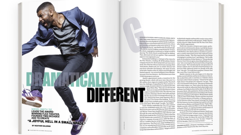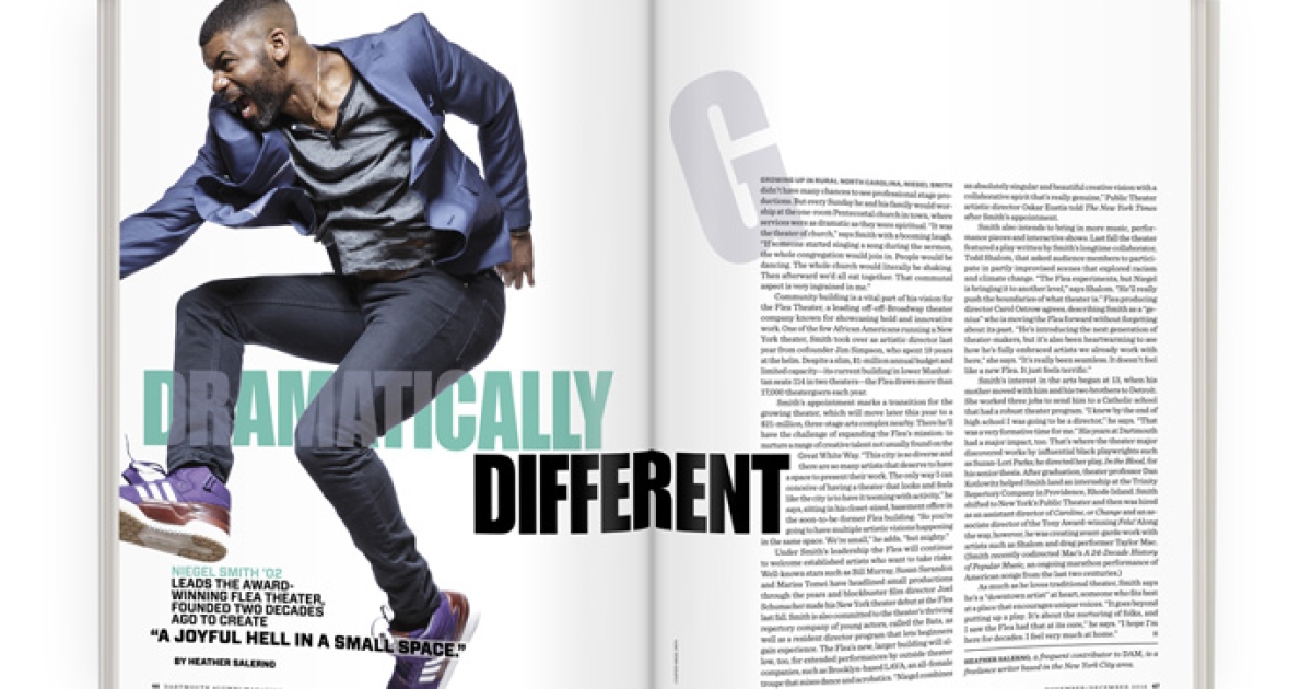 Smith’s interest in the arts began at 13, when his mother moved with him and his two brothers to Detroit. She worked three jobs to send him to a Catholic school that had a robust theater program. “I knew by the end of high school I was going to be a director,” he says. “That was a very formative time for me.” His years at Dartmouth had a major impact, too. That’s where the theater major discovered works by influential black playwrights such as Suzan-Lori Parks; he directed her play, In the Blood, for his senior thesis. After graduation, theater professor Dan Kotlowitz helped Smith land an internship at the Trinity Repertory Company in Providence, Rhode Island. Smith shifted to New York’s Public Theater and then was hired as an assistant director of Caroline, or Change and an associate director of the Tony Award-winning Fela! Along the way, however, he was creating avant-garde work with artists such as Shalom and drag performer Taylor Mac. (Smith recently codirected Mac’s A 24-Decade History of Popular Music, an ongoing marathon performance of American songs from the last two centuries.)