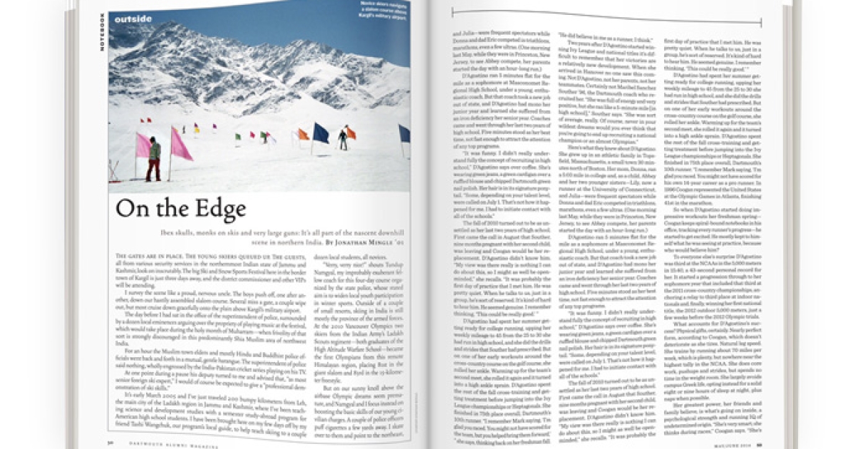 I discovered that there are corners of India where people are, believe it or not, as hungry for skiing as Dartmouth students. On my first trip in 2003 I became involved with a remarkable organization called the Zanskar Ski School (ZSS), which promotes skiing as a mode of transportation, communication and recreation during long winters in the remote valley of Zanskar, south and east of Kargil. Heavy snows cut off Zanskar and its one rutted road from the rest of the world for up to seven months a year. For decades, in a largely treeless landscape, people would jury-rig homemade skis from frozen hosepipe or castoff packing crates, lashing them to their shoes with baling wire or leather. Then ZSS came along, with donated equipment and tailored instruction.