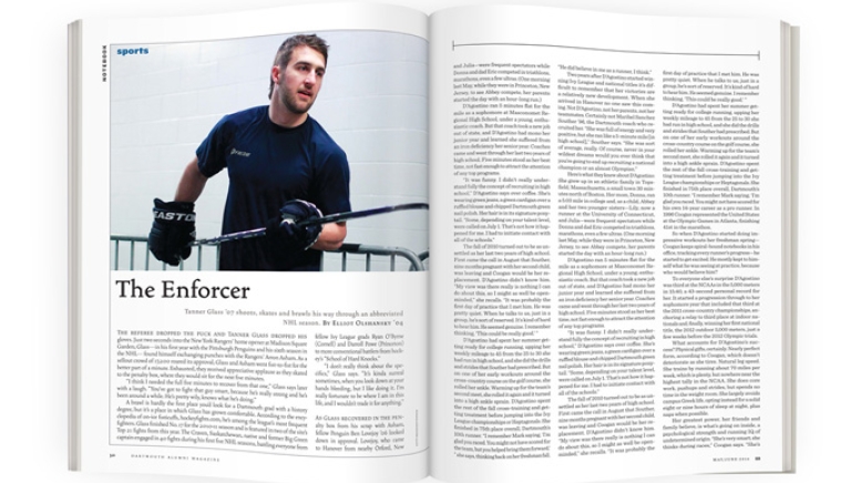 “It was really fun to see Tanner and Ben on the same team, even though it was a short duration,” says Dartmouth head hockey coach Bob Gaudet ’81. “The move for Ben is a good one.” As for Glass, his former coach isn’t the least bit surprised he has carved out a role for himself in the NHL.