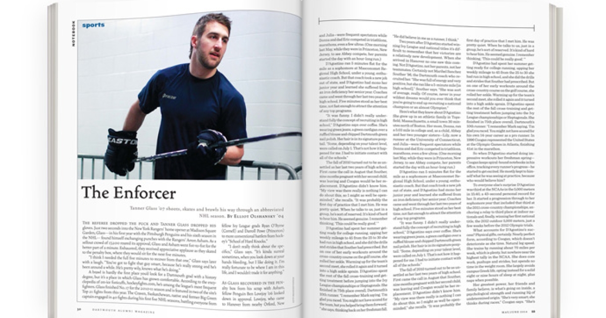 As Glass recovered in the penalty box from his scrap with Asham, fellow Penguin Ben Lovejoy ’06 looked down in approval. Lovejoy, who came to Hanover from nearby Orford, New Hampshire, and preceded Glass as hockey captain, never saw his teammate drop the gloves at Dartmouth—fighting in college hockey is cause for suspension, after all—but he has a definite appreciation of Glass’ pugilistic prowess.