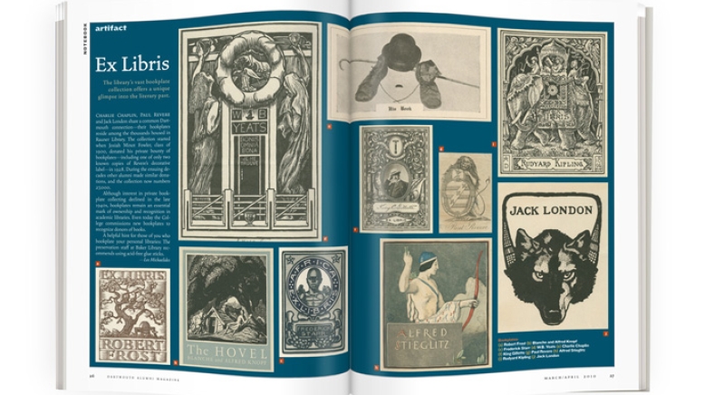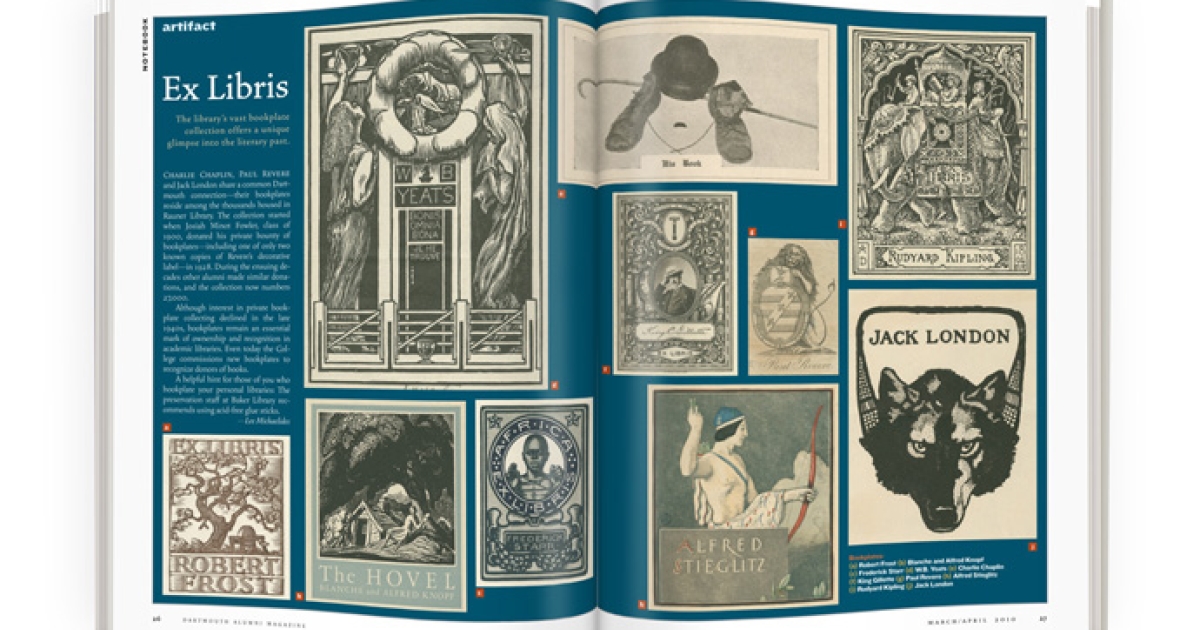 Charlie Chaplin, Paul Revere and Jack London share a common Dartmouth connection—their bookplates reside among the thousands housed in Rauner Library. The collection started when Josiah Minot Fowler, class of 1900, donated his private bounty of bookplates—including one of only two known copies of Revere’s decorative label—in 1928. During the ensuing decades other alumni made similar donations, and the collection now numbers 27,000. Although interest in private bookplate collecting declined in the late 1940s, bookplates remain an essential mark of ownership and recognition in academic libraries. Even today the College commissions new bookplates to recognize donors of books.