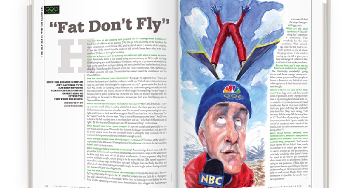 How has that affected your commentary? Long ago my approach was, “You’ve got to show the Americans.” And the producers would say, “Nobody cares that an American came in 43rd when they thought he might come in 47th.” I guess maybe I’ve drunk the Kool-Aid. At the ski-jumping venue there are 100 cool stories going on and 100 little personal victories and losses, any one of which might be compelling, but you’ve got 15 minutes. You’ve got to pick the one or the five you think are going to resonate with the guy sitting on the couch in Des Moines, because you don’t want him flipping over to Desperate Housewives.