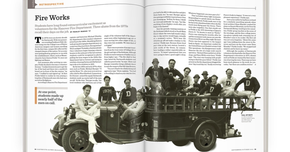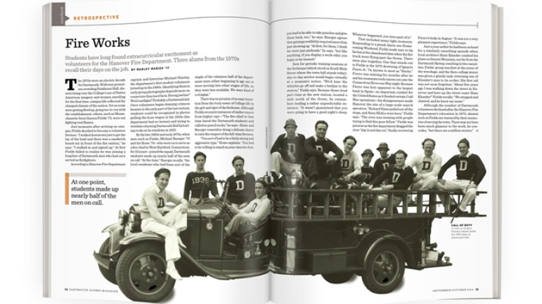 Although the number of Dartmouth volunteers declined after the Hanover Fire Department’s relocation in 1973, alumni such as Fields are warmed by their memories of serving the town. There may not have been much glamour to the work, he concedes, “but there are a million stories.”