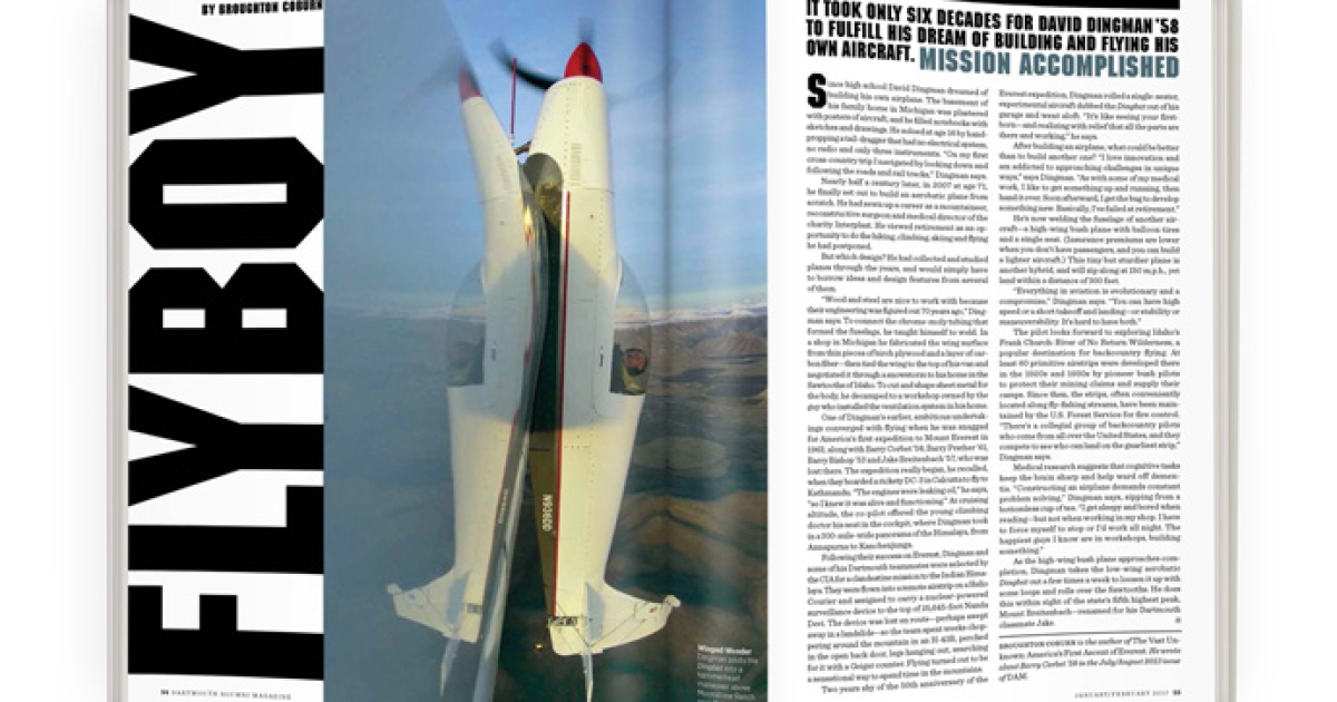 Two years shy of the 50th anniversary of the Everest expedition, Dingman rolled a single-seater, experimental aircraft dubbed the Dingbat out of his garage and went aloft. “It’s like seeing your firstborn—and realizing with relief that all the parts are there and working,” he says.