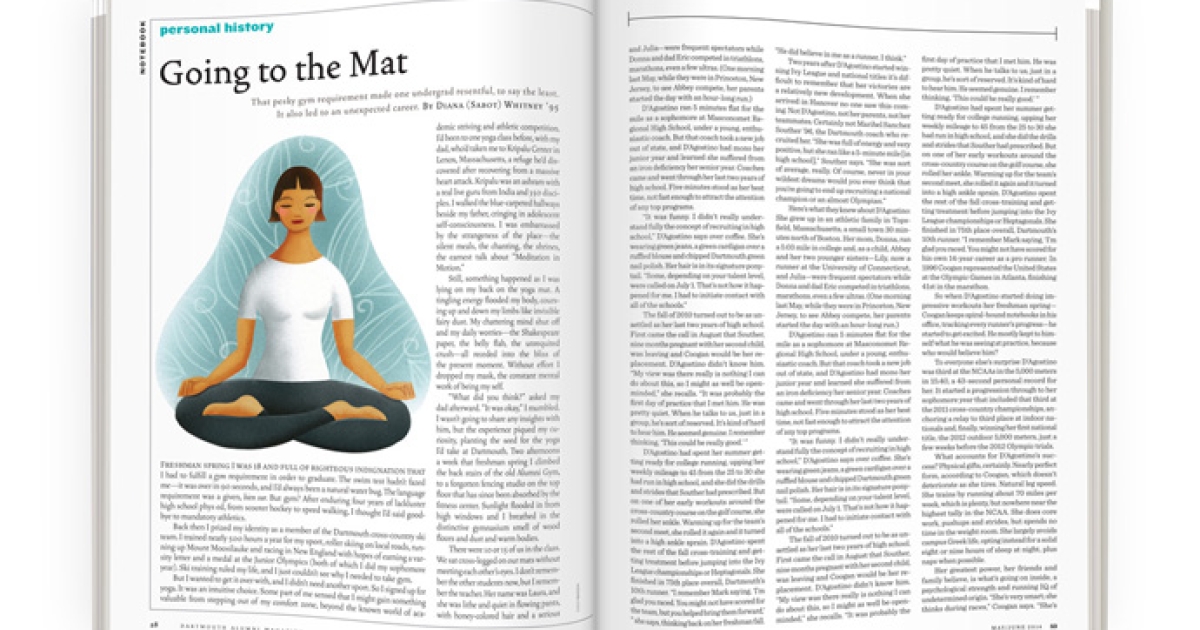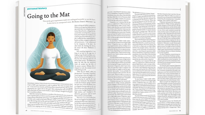 Yoga began as a curiosity, evolved into a hobby and became a calling. Now I can’t imagine my life without it. So I want to thank the Dartmouth officials who mandated a gym requirement—and bow Namaste to my college yoga teacher, wherever she is now.