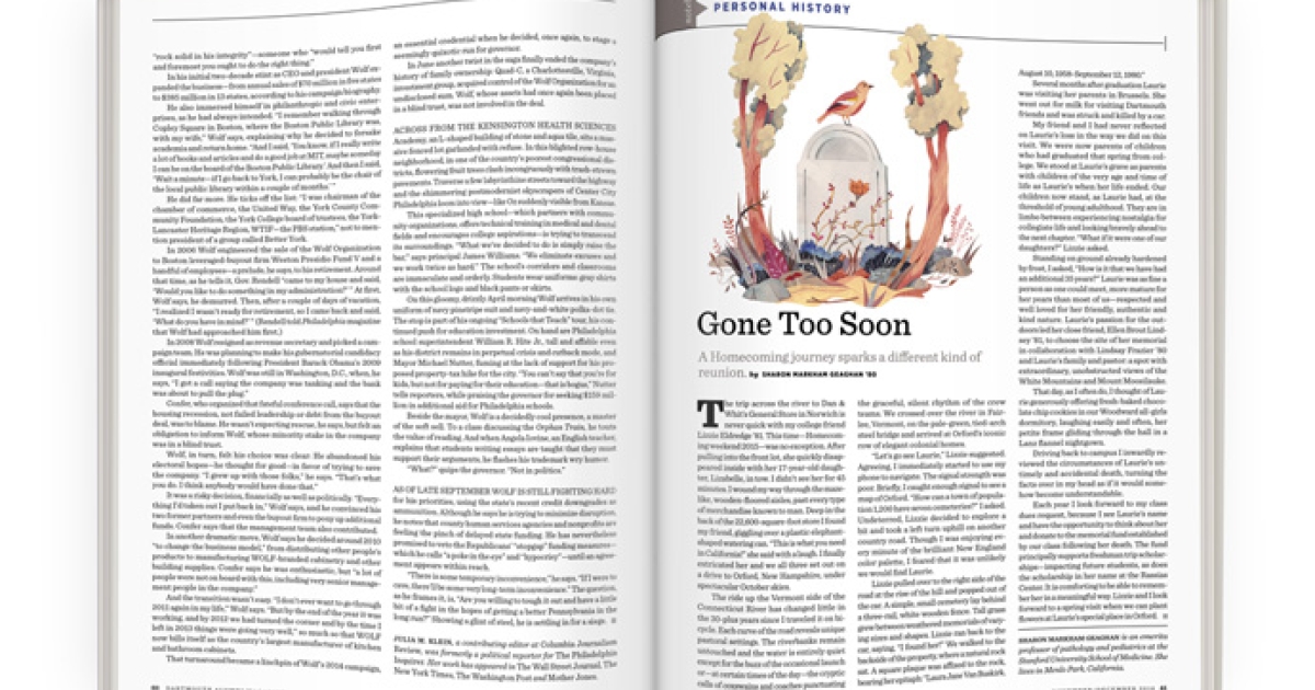 Each year I look forward to my class dues request, because I see Laurie’s name and have the opportunity to think about her and donate to the memorial fund established by our class following her death. The fund principally supports freshman trip scholarships—impacting future students, as does the scholarship in her name at the Rassias Center. It is comforting to be able to remember her in a meaningful way. Lizzie and I look forward to a spring visit when we can plant flowers at Laurie’s special place in Orford.