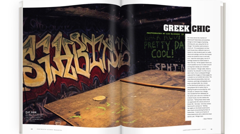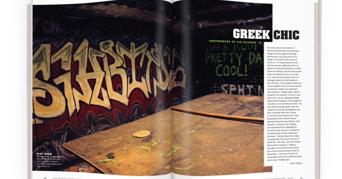 For many alums the mention of Dartmouth fraternities and sororities brings to mind images of partying, drinking and, yes, pong. But for Liz Klinger ’10 another word comes to mind: art. “It’s surprising to me how each house has a different look to it, based on what students paint on walls, doors and ceilings, and how the houses evolve as students move in and add to it,” says the recent grad, now an IT strategy analyst for Credit Suisse in New York City. “At Psi Upsilon there’s so much excellent art but it’s been around so long that nobody can remember who created it,” Klinger adds. (Note to students: You shouldn’t try this in your dorm room.) As an undergrad Klinger captured the images on these pages for a student-run art exhibit last winter. The show featured pong tables, beer-can creations, paintings, photography and even a tie-dyed toilet. As a review in The Dartmouth pointed out, many pong players fail to realize they’re playing the game surrounded by—and actually on—pieces of art. Klinger, who transferred from Wellesley for her senior year, was not a member of a Greek house, but she wishes she had been. “Taking these shots made me appreciate the culture and art of Greek life,” she says, “and how artistic Dartmouth’s campus is.” Setting her sights on the Greek social scene also meant encountering the fetor of fraternities. “I came out of some of those basements with a distinctive beer stench, yes,” Klinger says.