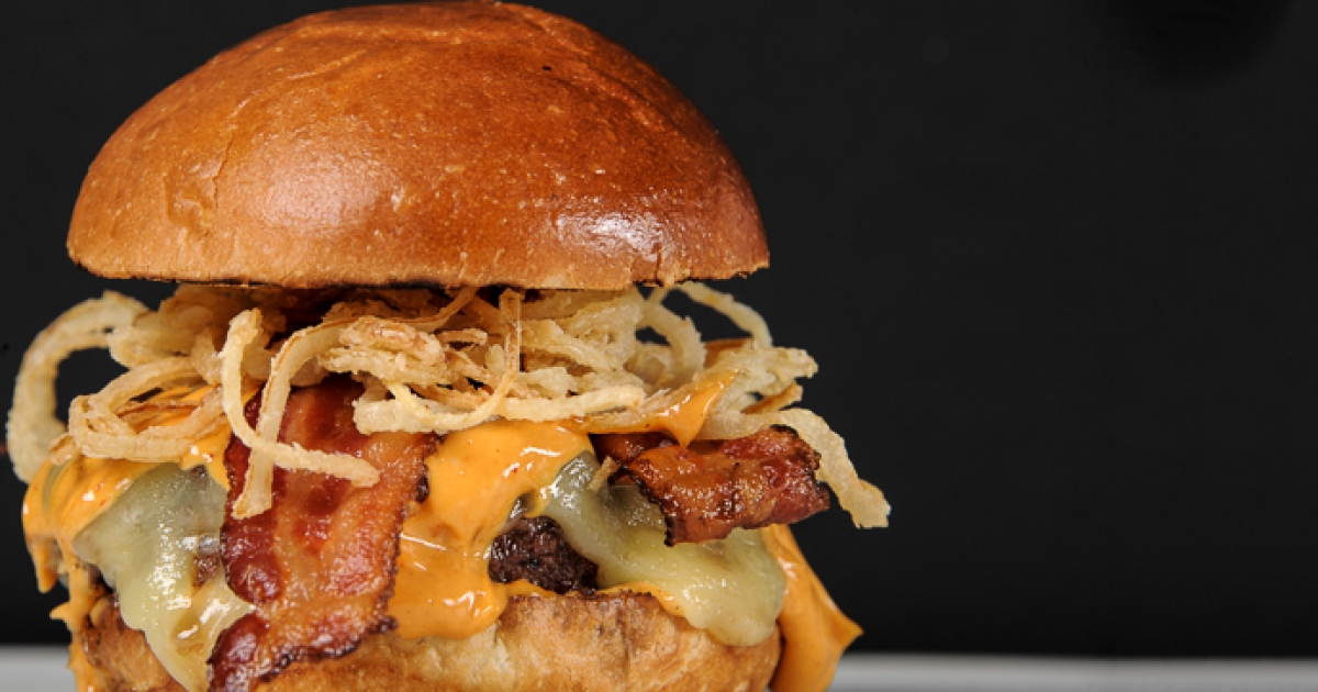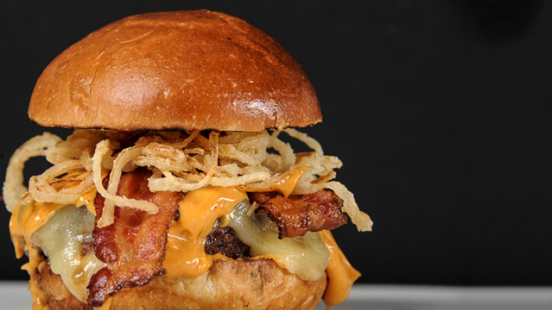 - On a medium- to high-heat grill mark off the burger for 45 seconds. Turn the burger a quarter turn and mark off for an additional 45 seconds. Flip the burger over and repeat as you did the first side of the burger. Once the burger is completely marked off on both sides place the burger in a 325-degree oven for 7-8 minutes or until medium rare. Remove the burger from the oven and top with the cheddar cheese. Place back in the oven for 20 seconds to melt the cheese. Quickly griddle the brioche burger bun for added texture and flavor. Place the burger on the brioche bun and add the chipotle mayo, bacon and crispy onion rings.