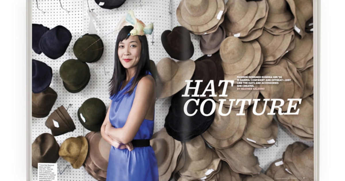 Step into Eugenia Kim’s private showroom in Manhattan’s garment district and you’ll find a perfectly curated selection of the hatmaker’s latest creations. There are shelves of playful knit toppers, including the double pom-pom beanie beloved by Beyoncé and Iggy Azalea. One wall displays the same felt fedoras that Sienna Miller modeled in Vogue earlier this year. A flurry of beach-worthy styles—favorites of Taylor Swift and Katy Perry—are featured, too. One wide-brimmed sunhat is embroidered with the cheeky message, “Wish you were here.” And no Kim collection would be complete without her signature cat-ear design, such as the knit Felix cap and sculpted Caterina beret worn by Amy Poehler and Nicki Minaj.