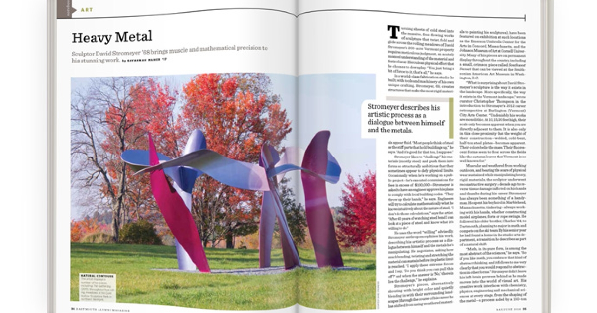 Muscular and weathered from working outdoors, and bearing the scars of physical wear sustained while manipulating heavy, rigid materials, the sculptor underwent reconstructive surgery a decade ago to reverse tissue damage inflicted on his hands and thumbs during his career. Stromeyer has always been something of a handyman. He spent his boyhood in Marblehead, Massachusetts, tinkering—always working with his hands, whether constructing model airplanes, forts or rope swings. He followed his older brother, Charles ’64, to Dartmouth, planning to major in math and compete on the ski team. By his senior year he had found a home in the studio arts department, a transition he describes as part of a natural shift.