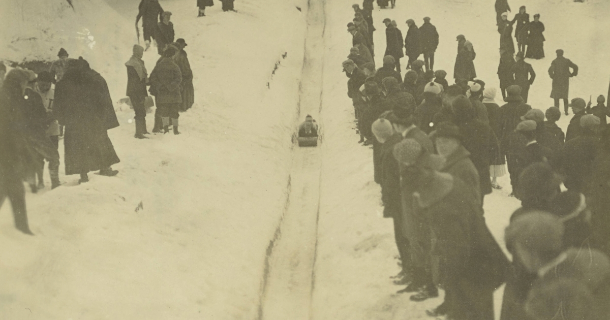 Incandescent bulbs illuminated the Occom Pond run at night. “We had three rides on it one very fast night. O, you sure do go. I’m sure at least forty miles an hour. It is all iced,” wrote an anonymous 1926 tobogganer. A newly built 30-foot tower—whose construction required the town to close the neighborhood road for a week—ensured the downhill racers would have enough momentum to cross the pond and coast to the Outing Club House.