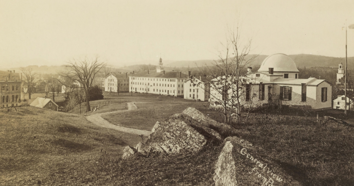 In 1854 College trustees decided “the field north of the College grounds in which the observatory is situated be appropriated as college grounds and never more for pasturage.” It isn’t clear what specific concern, if any, prompted them to set aside the romantic landscape that became College Park and one of Dartmouth’s greatest treasures. Perhaps it was nothing more than the influence of the Victorian-era popularity of parks and park-like settings. As the College’s 1869 centennial approached, trustees called for a general improvement of the entire campus grounds and hired the Boston landscape firm of Lee and Follen to prepare a plan to improve the park lands. Nothing came of the Lee and Follen design, but Judge Joel Parker, class of 1811, responded with a suggestion of his own. Parker wrote the following in an 1867 letter to President Asa Smith.