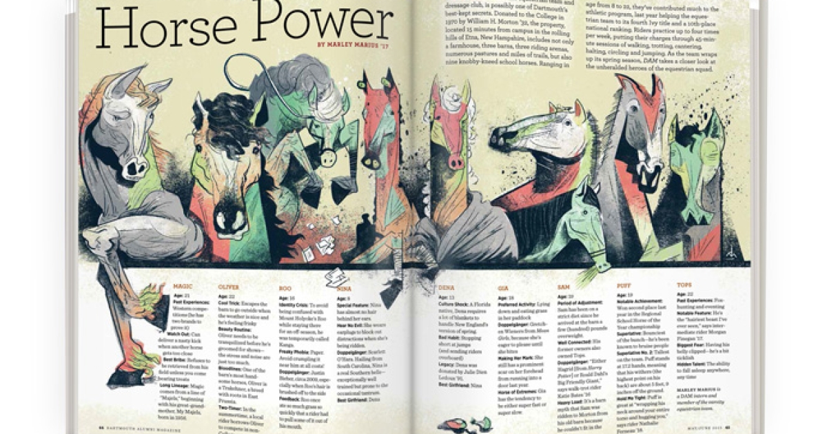 Morton Farm, home to the equestrian team and dressage club, is possibly one of Dartmouth’s best-kept secrets. Donated to the College in 1970 by William H. Morton ’32, the property, located 15 minutes from campus in the rolling hills of Etna, New Hampshire, includes not only a farmhouse, three barns, three riding arenas, numerous pastures and miles of trails, but also nine knobby-kneed school horses. Ranging in age from 8 to 22, they’ve contributed much to the athletic program, last year helping the equestrian team to its fourth Ivy title and a 10th-place national ranking. Riders practice up to four times per week, putting their charges through 45-minute sessions of walking, trotting, cantering, halting, circling and jumping. As the team wraps up its spring season, DAM takes a closer look at the unheralded heroes of the equestrian squad.