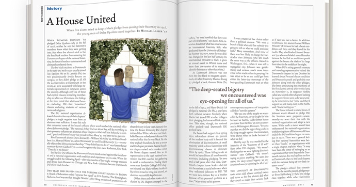 When Raymond Johnson ’59 pledged Delta Upsilon early in the fall of 1956, neither he nor the fraternity’s members knew what they were getting into. But when five alumni tried to bar the first black student from entering the Dartmouth chapter of the national fraternity, the house’s brothers outsmarted and ultimately outlasted them.