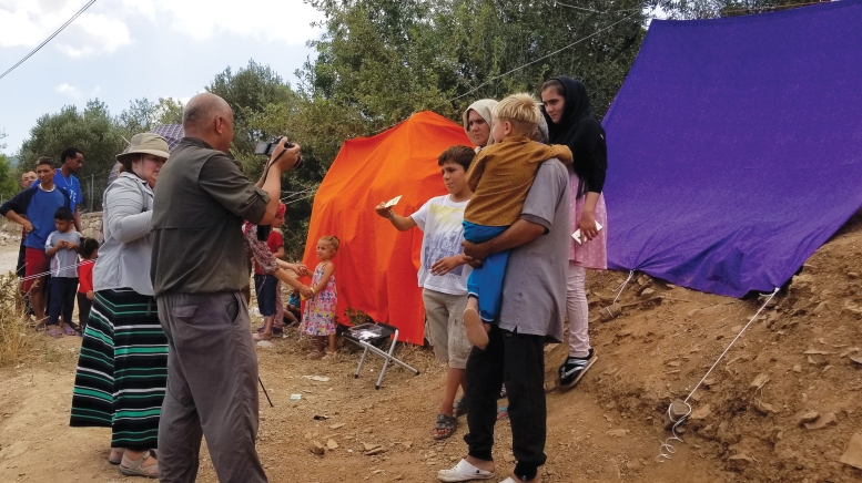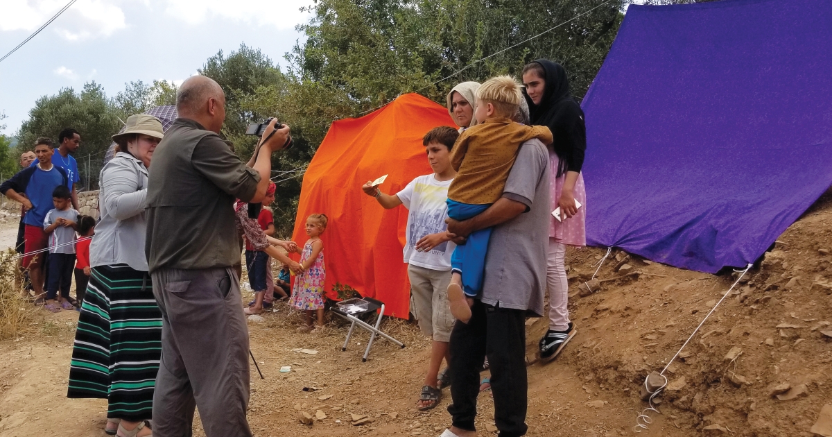 When she and her husband returned to Chios six months later they brought the makings of a photo studio—bright-orange backdrops, high-speed portable printers, and other gear. A young guard led them to a dusty spot outside the fence at Vial next to putrid latrines and steps from a busy road where cars sped by. They strung a tarp to control the lighting, and for power they snaked a 100-foot extension cord into the camp.