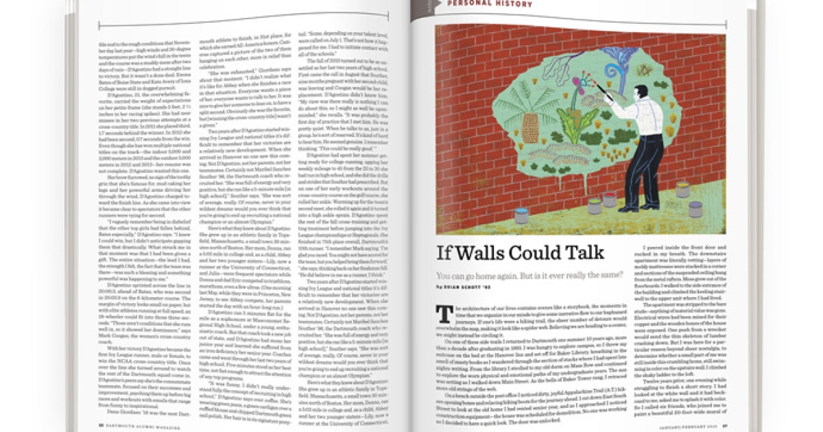 On one of these side trails I returned to Dartmouth one summer 10 years ago, more than a decade after graduating in 1993. I was hungry to explore campus, so I threw my suitcase on the bed at the Hanover Inn and set off for Baker Library, breathing in the smell of musty books as I wandered through the section of stacks where I had spent late nights writing. From the library I strolled to my old dorm on Mass Row and continued to explore the worn physical and emotional paths of my undergraduate years. The sun was setting as I walked down Main Street. As the bells of Baker Tower rang, I retraced more old strings of the web.