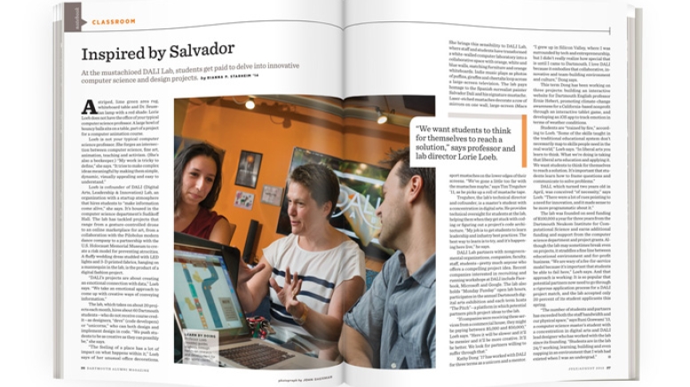 The lab was founded on seed funding of $100,000 a year for three years from the Dartmouth Neukom Institute for Computational Science and earns additional funding and support from the computer science department and project grants. Although the lab may sometimes break even on projects, it straddles a fine line between educational environment and for-profit business. “We are wary of a fee-for-service model because it’s important that students be able to fail here,” Loeb says. And that approach is working: It is so popular that potential partners now need to go through a rigorous application process for a DALI project match, and the lab accepted only 20 percent of its student applicants this spring.