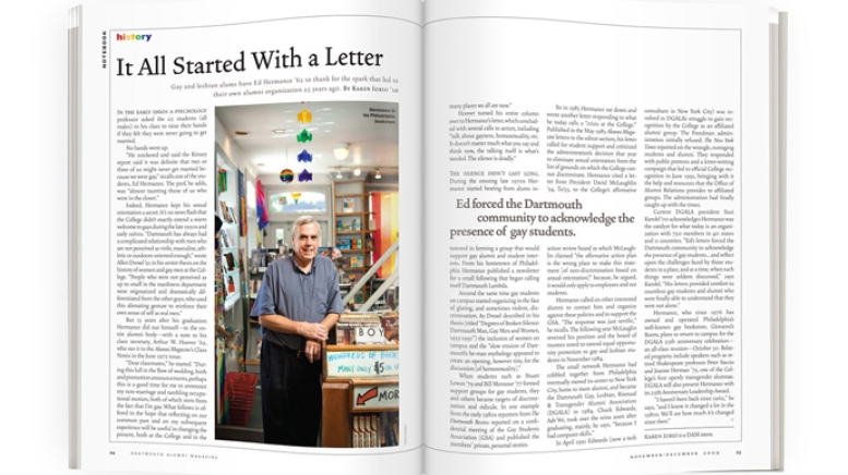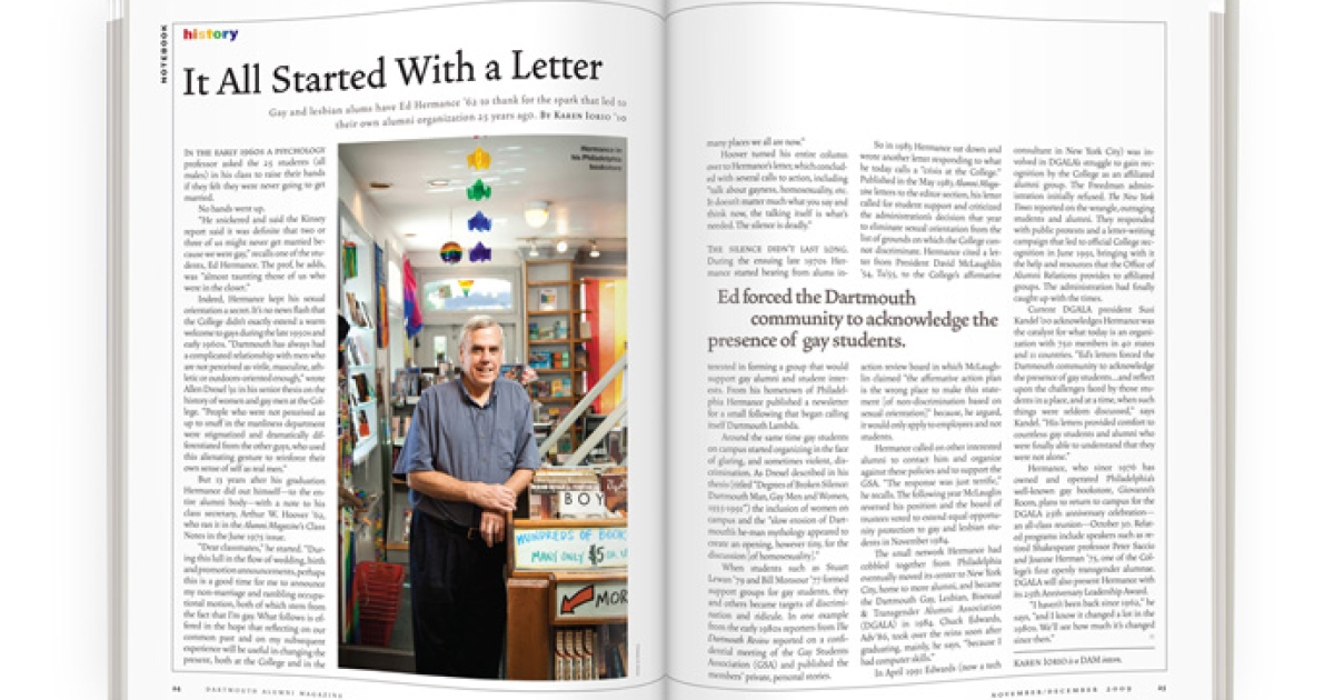 Current DGALA president Susi Kandel ’00 acknowledges Hermance was the catalyst for what today is an organization with 750 members in 40 states and 11 countries. “Ed’s letters forced the Dartmouth community to acknowledge the presence of gay students…and reflect upon the challenges faced by those students in a place, and at a time, when such things were seldom discussed,” says Kandel. “His letters provided comfort to countless gay students and alumni who were finally able to understand that they were not alone.”