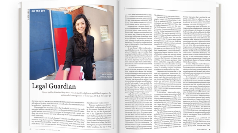 By some measures she seems an unlikely choice to be leading the charge for family court reform. A Spanish/English double major, Mendenhall thought she wanted to work in the fashion industry and interned with Donna Karan while at Dartmouth. In other ways her choice of job makes total sense, she says. Growing up as the daughter of a white father and Korean immigrant mother in a largely Latino section of Encinitas, California, Mendenhall often felt out of place and was occasionally taunted with Asian slurs. “I was raised with a sense of empathy for the other,” she says.