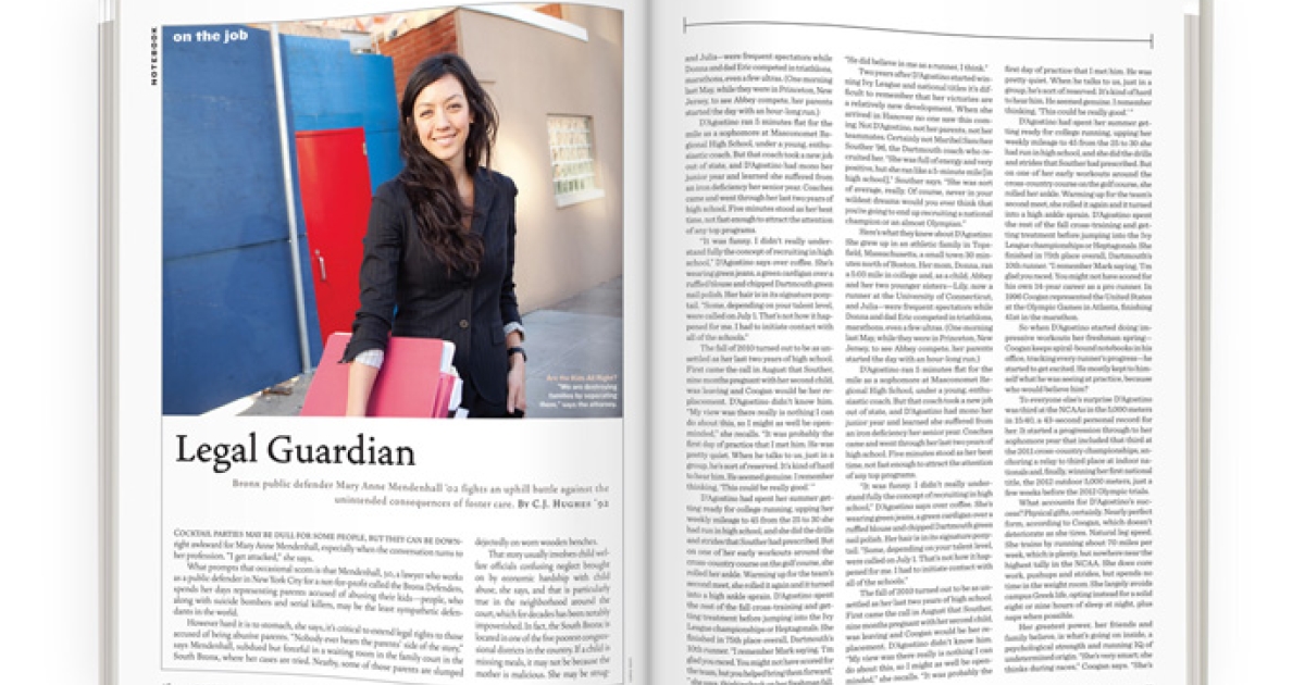 What prompts that occasional scorn is that Mendenhall, 30, a lawyer who works as a public defender in New York City for a not-for-profit called the Bronx Defenders, spends her days representing parents accused of abusing their kids—people, who along with suicide bombers and serial killers, may be the least sympathetic defendants in the world.