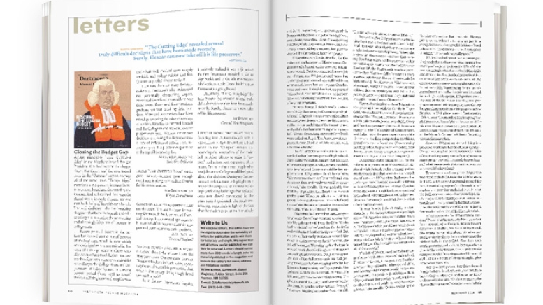 As I skimmed further toward the front of the magazine I found I had too few fingers for marking pages to return to later, when I hoped to have more time to read in depth. Then the pleasure of reaching the “Letters” section at the front and spotting the comment from Christopher Schons ’88: “Wow! Maybe my alma mater is more interesting than I had thought.” Hear, hear—and thank you very much.