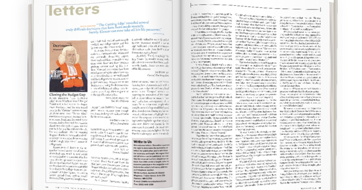 No one could have been more surprised than I the minute I saw the May/June cover: Our esteemed founder Eleazar Wheelock in black robes, sporting the usual wig of his generation…but what is that orange thing snugly fitted around his neck? As a former Dartmouth kayaker I suddenly realized it was a life jacket! Further inspection revealed a dollar sign buckle and to the left an ominous black-colored circle. Does this hint that Dartmouth is going broke? Thankfully, “The Cutting Edge” by Julie Sloane ’99 revealed several truly difficult decisions that have been made recently. Surely, Eleazar can now take off his life preserver.