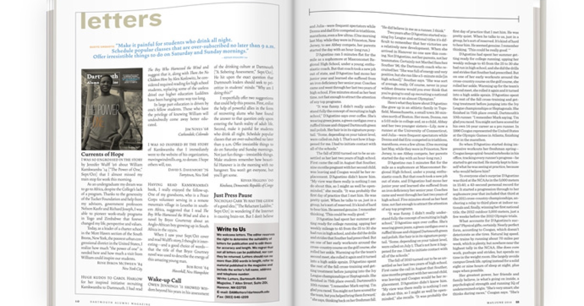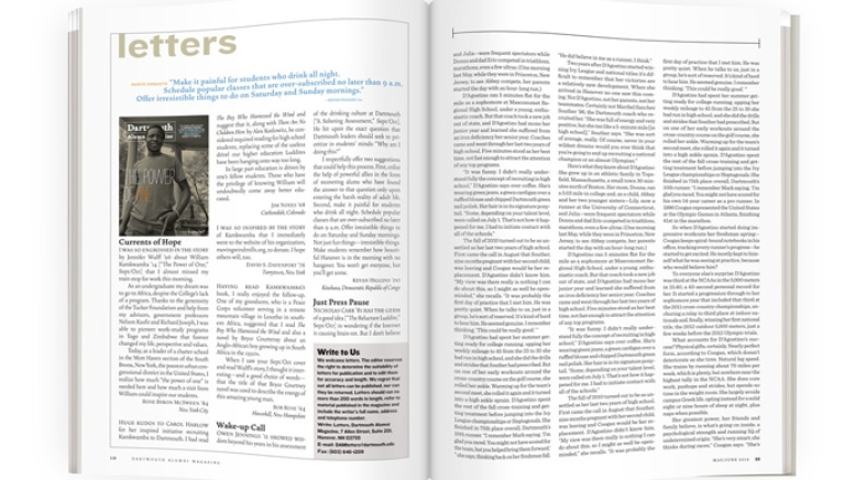 Wake-up Call Owen Jennings ’11 showed wisdom beyond his years in his assessment of the drinking culture at Dartmouth [“A Sobering Assessment,” Sept/Oct]. He hit upon the exact question that Dartmouth leaders should seek to prioritize in students’ minds: “Why am I doing this?” I respectfully offer two suggestions that could help this process. First, enlist the help of powerful allies in the form of recovering alums who have found the answer to that question only upon entering the harsh reality of adult life. Second, make it painful for students who drink all night. Schedule popular classes that are over-subscribed no later than 9 a.m. Offer irresistible things to do on Saturday and Sunday mornings. Not just fun things—irresistible things. Make students remember how beautiful Hanover is in the morning with no hangover. You won’t get everyone, but you’ll get some.