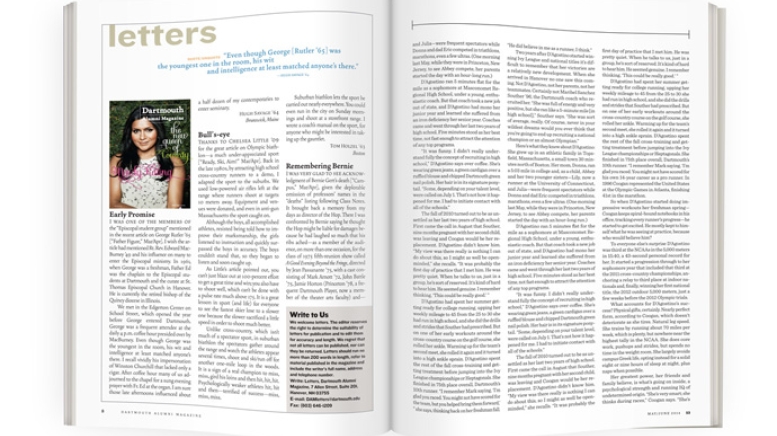 Early Promise I was one of the members of the “Episcopal student group” mentioned in the recent article on George Rutler ’65 [“Father Figure,” Mar/Apr]. I wish the article had mentioned Rt. Rev. Edward MacBurney ’49 and his influence on many to enter the Episcopal ministry. In 1961, when George was a freshman, Father Ed was the chaplain to the Episcopal students at Dartmouth and the curate at St. Thomas Episcopal Church in Hanover. He is currently the retired bishop of the Quincy diocese in Illinois. We met in the Edgerton Center on School Street, which opened the year before George entered Dartmouth. George was a frequent attendee at the daily 4 p.m. coffee hour presided over by MacBurney. Even though George was the youngest in the room, his wit and intelligence at least matched anyone’s there. I recall vividly his impersonation of Winston Churchill that lacked only a cigar. After coffee hour many of us adjourned to the chapel for a sung evening prayer with Fr. Ed at the organ. I am sure those late afternoons influenced about a half dozen of my contemporaries to enter seminary.