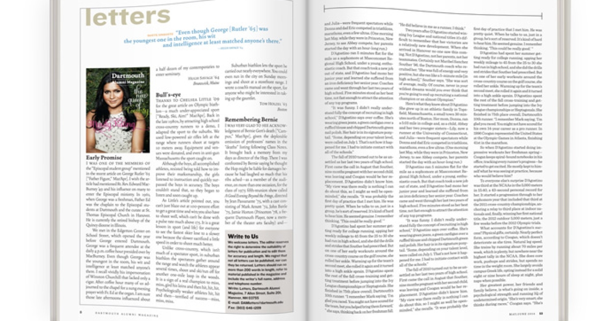 Bull’s-eye Thanks to Chelsea Little ’09 for the great article on Olympic biathlon—a much under-appreciated sport [“Ready, Ski, Aim!” Mar/Apr]. Back in the late 1980s, by attracting high school cross-country runners to a demo, I adapted the sport to the suburbs. We used low-powered air rifles left at the range where runners shoot at targets 10 meters away. Equipment and venues were donated, and even in anti-gun Massachusetts the sport caught on. Although the boys, all accomplished athletes, resisted being told how to improve their marksmanship, the girls listened to instruction and quickly surpassed the boys in accuracy. The boys couldn’t stand that, so they began to listen and soon caught up. As Little’s article pointed out, you can’t just blaze out at 100-percent effort to get a great time and win; you also have to shoot well, which can’t be done with a pulse rate much above 175. It is a great lesson in sport (and life) for everyone to see the fastest skier lose to a slower one because the slower sacrificed a little speed in order to shoot much better. Unlike cross-country, which isn’t much of a spectator sport, in suburban biathlon the spectators gather around the range and watch the athletes appear several times, shoot and ski/run off for another one-mile loop in the woods. It is a sign of a real champion to miss, miss, gird his loins and then hit, hit, hit. Psychologically weaker athletes hit, hit and then—terrified of success—miss, miss, miss. Suburban biathlon lets the sport be carried out nearly everywhere. You could even run in the city on Sunday mornings and shoot at a storefront range. I wrote a coach’s manual on the sport, for anyone who might be interested in taking up the gauntlet.