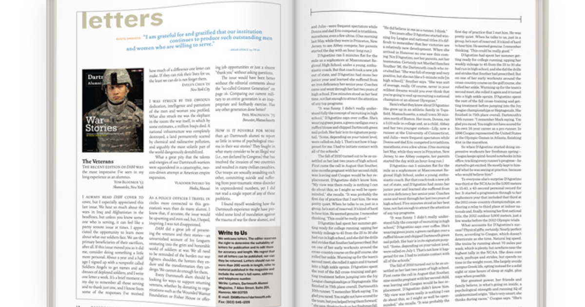 As a police officer I travel in circles more connected to this generation’s wars than do many alumni. I knew that, if accurate, the issue would be upsetting and even sad, but, I hoped, inspiring. I was not disappointed. DAM did a great job of presenting the veterans and their stories—an unvarnished account of Ivy Leaguers venturing into the grim and honorable world of soldiers at war. We all need to be reminded of the burden our war fighters shoulder, the horrors they endure and the transformation they undergo. We cannot do enough for them. Every Dartmouth alum should be looking for ways to support returning veterans, whether by donating to organizations such as the Wounded Warrior Foundation or Fisher House or offering job opportunities or just a sincere “thank you” without asking questions. The issue would have been better without the editorial comments about the “so-called Greatest Generation” on page 16. Comparing our current military to an entire generation is an inappropriate and foolhardy exercise. Has any other generation done better?