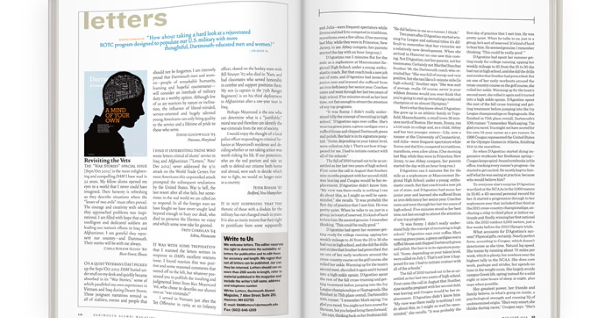 On a quiet Veterans Day I picked up the Sept/Oct 2012 DAM buried under stuff on my desk and quickly became absorbed in its “War Stories,” some of which paralleled my own experiences in Vietnam and Iraq during Desert Storm. These poignant narratives remind us all of realities, events and people that should not be forgotten. I am intensely proud that Dartmouth men and women—people of remarkable humanity, learning and hopeful countenance—will consider an interlude of military duty as a worthy option. Although few of us are warriors by nature or inclination, the influence of liberal-minded, service-oriented and hugely talented young Americans can only bring quality to the service and a lifetime of pride to those who serve.