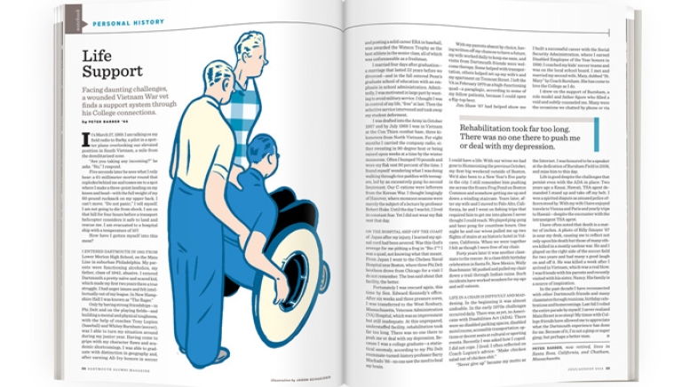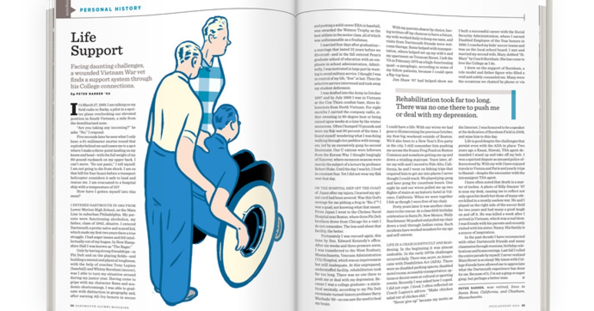 With my parents absent by choice, having written off my chances to have a future, my wife worked daily to keep me sane, and visits from Dartmouth friends were welcome therapy. Some helped with transportation, others helped set up my wife’s and my apartment on Tremont Street. I left the VA in February 1970 as a high-functioning quad—a paraplegic, according to some of my fellow patients, because I could open a flip-top beer.