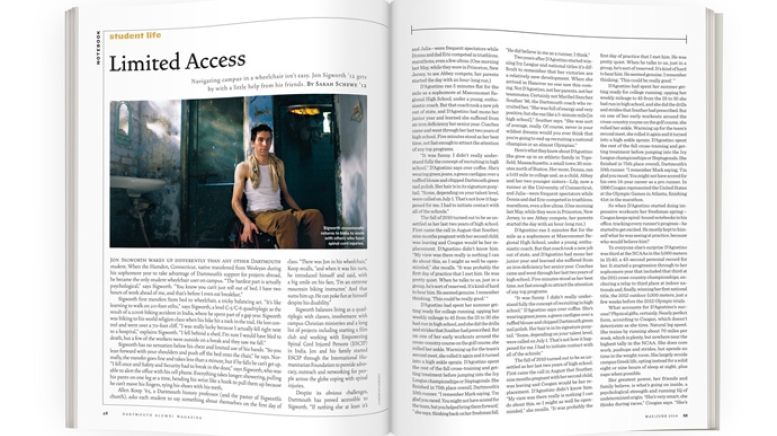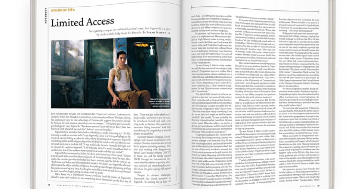 Jon Sigworth wakes up differently than any other Dartmouth student. When the Hamden, Connecticut, native transferred from Wesleyan during his sophomore year to take advantage of Dartmouth’s support for projects abroad, he became the only student wheelchair user on campus. “The hardest part is actually psychological,” says Sigworth. “You know you can’t just roll out of bed. I have two hours of work ahead of me, and that’s before I even eat breakfast.”