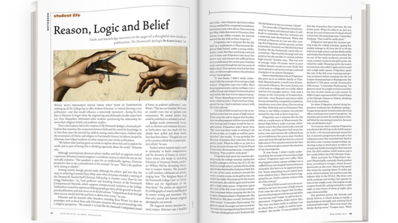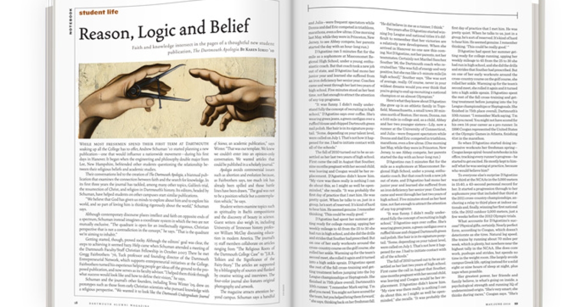 The magazine attracts attention beyond campus. Schuman says a handful of current students chose the College because they had first read Apologia. “Last year,” he says, “there were three students who came up to me and said, ‘If there’s a publication and students at Dartmouth who really want to think intellectually and vigorously about their faith, this is a place where I want to be.’ ”