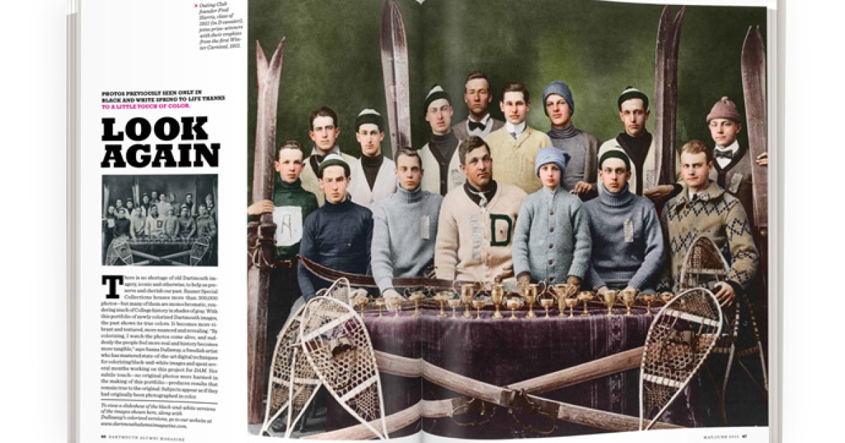 There is no shortage of old Dartmouth imagery, iconic and otherwise, to help us preserve and cherish our past. Rauner Special Collections houses more than 300,000 photos—but many of them are monochromatic, rendering much of College history in shades of gray. With this portfolio of newly colorized Dartmouth images, the past shows its true colors. It becomes more vibrant and textured, more nuanced and revealing. “By colorizing, I watch the photos come alive, and suddenly the people feel more real and history becomes more tangible,” says Sanna Dullaway, a Swedish artist who has mastered state-of-the-art digital techniques for colorizing black-and-white images and spent several months working on this project for DAM. Her subtle touch—no original photos were harmed in the making of this portfolio—produces results that remain true to the original: Subjects appear as if they had originally been photographed in color.