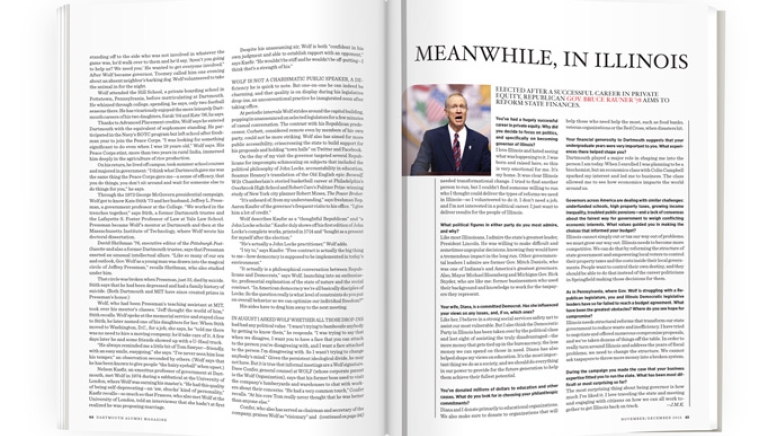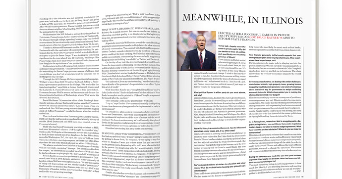 What political figures in either party do you most admire, and why? Like most Illinoisans, I admire the state’s greatest leader, President Lincoln. He was willing to make difficult and sometimes unpopular decisions, knowing they would have a tremendous impact in the long run. Other governmental leaders I admire are former Gov. Mitch Daniels, who was one of Indiana’s and America’s greatest governors. Also, Mayor Michael Bloomberg and Michigan Gov. Rick Snyder, who are like me: former businessmen who used their background and knowledge to work for the taxpayers they represent.