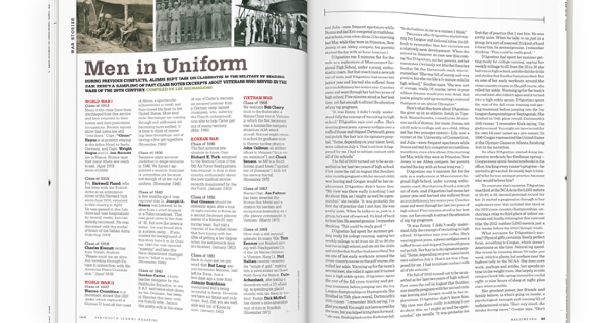 We welcome Bob Cleary back to the States after a Marine Corps tour in Vietnam in which the first lieutenant was a bombardier-navigator aboard an AGA attack aircraft. Bob just might return to school for graduate work in thermo-nuclear physics. John Calhoun, an artillery officer in Vietnam (“it’s a rotten existence”), and Chuck Benson, an MP in a South Korean guard tower (“spotted lots of pheasants”), both left the service this fall. (November 1970)