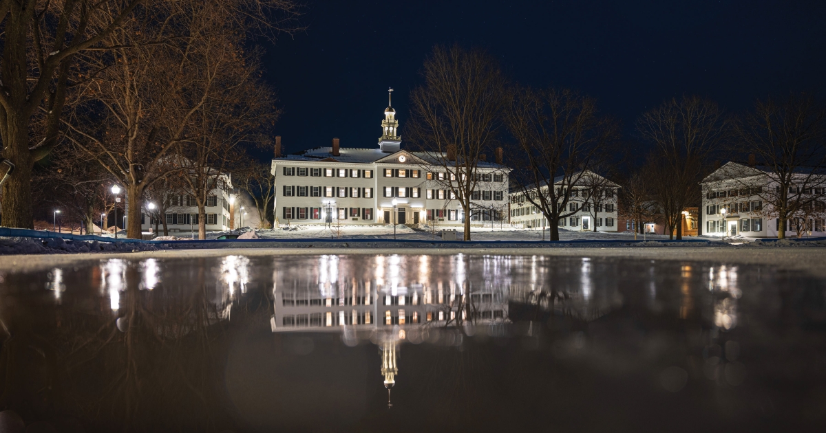 The early evening glow from Dartmouth Hall shimmers on the Green’s ice skating surface in mid-January, when the temperature peaked in the teens. The 70-by-120-foot rink returned after a two-year hiatus.