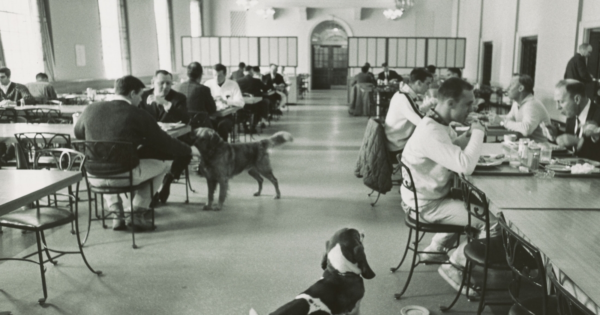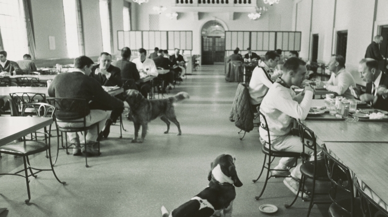 A lot of Dartmouth people are owned by dogs. President John Sloan Dickey belongs to a big golden retriever who sits beside the president’s desk in the administration building all day and walks him home every night on a leash, to make sure that Dr. Dickey doesn’t run away. During a fraternity initiation one of the pledges had to survey all the Hanover dogs, to determine which was the largest. He measured 57 dogs, and Dr. Dickey’s was second. (The winner was an elderly St. Bernard who is associated with the English Department.)