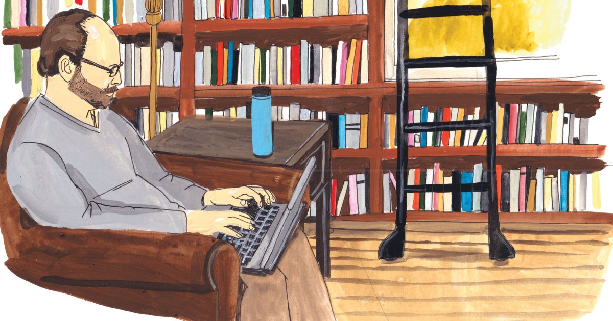Right now, my writing spot is the library at the school where my wife works. I have this little chair—a leather chair that looks very much out of place in this library, but everybody knows it’s sort of my chair. I always say anybody can use it if they want to—they just have to beat me there in the morning, and I get there at about 5:30.