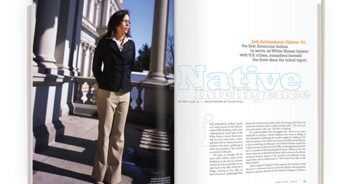 It’s understandable that the biggest D.C. storm in 50 years would fail to impress a South Dakotan who went to college in New Hampshire. Although the weather might be “nothing,” Gillette’s occupancy of the office just across the hall from the balcony is truly something. In February 2009 Barack Obama named her a deputy associate director of the Office of Intergovernmental Affairs. A member of the Standing Rock Sioux, Gillette is the first Native American to hold the position, which serves as the administration’s primary liaison to the country’s 564 federally recognized tribes. Or, as Gillette puts it: “We’re their front door to the White House.”