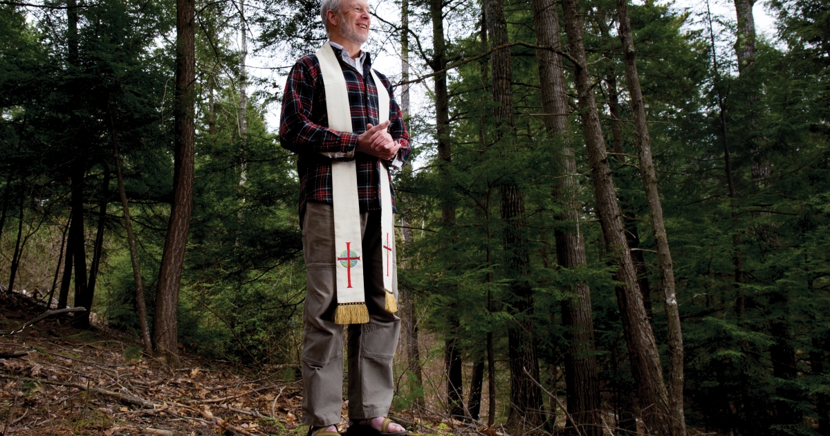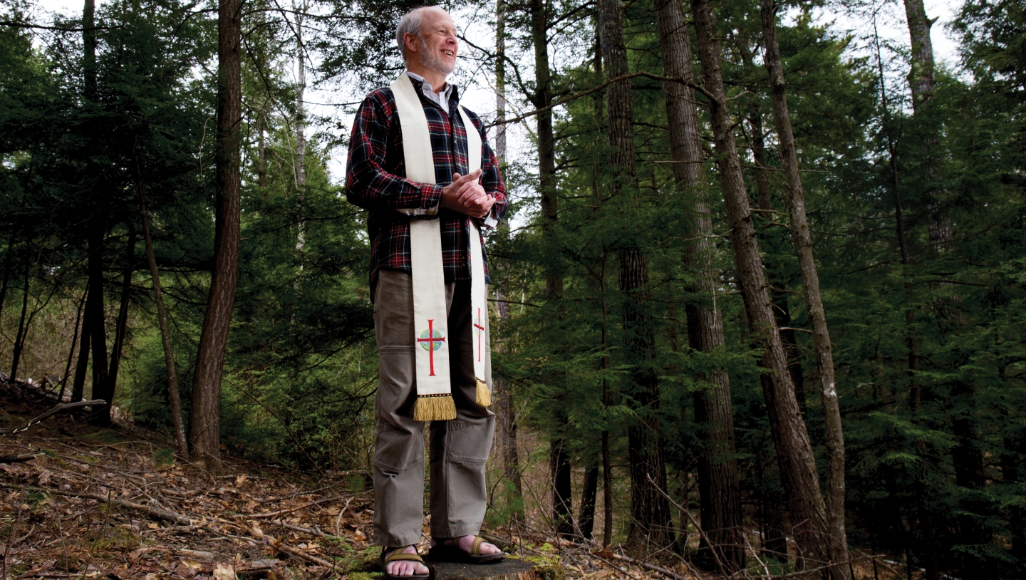 His church is not a standard house of worship made with hands. It’s a scarred, recovering woodlot. He conducts his services outside, year-round, in all weather. He calls it the Church of the Woods.