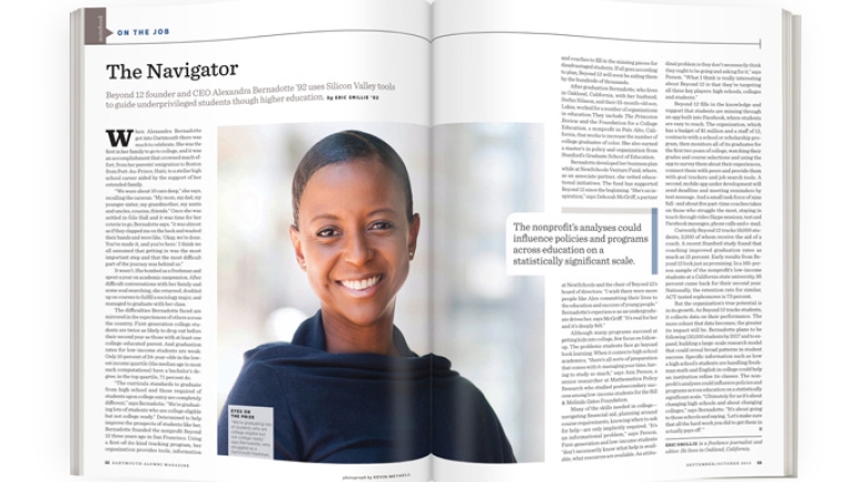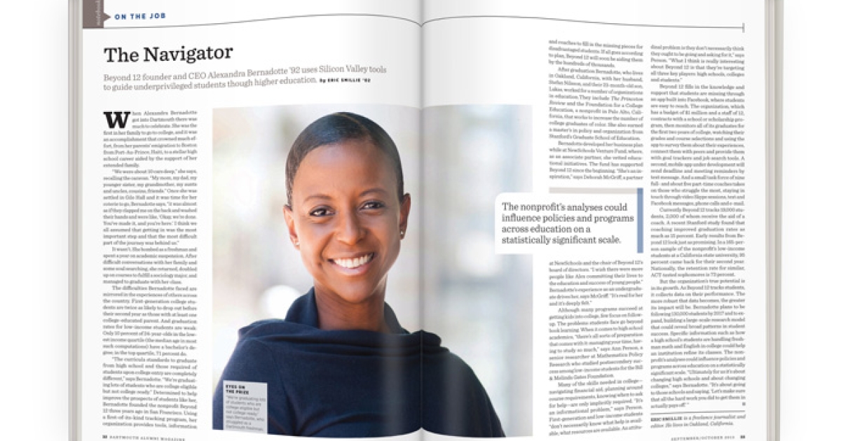 Bernadotte developed her business plan while at NewSchools Venture Fund, where, as an associate partner, she vetted educational initiatives. The fund has supported Beyond 12 since the beginning. “She’s an inspiration,” says Deborah McGriff, a partner at NewSchools and the chair of Beyond 12’s board of directors. “I wish there were more people like Alex committing their lives to the education and success of young people.” Bernadotte’s experience as an undergraduate drives her, says McGriff. “It’s real for her and it’s deeply felt.”