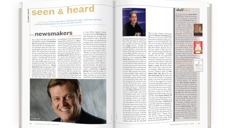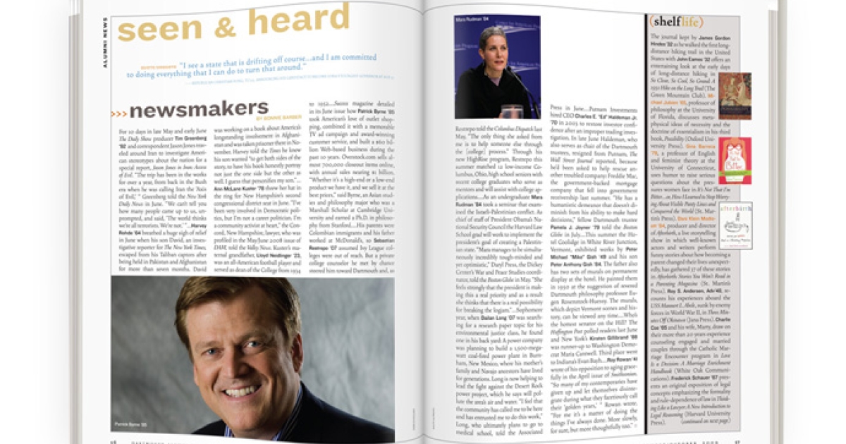 As an undergraduate Mara Rudman ’84 took a seminar that examined the Israeli-Palestinian conflict. As chief of staff of President Obama’s National Security Council the Harvard Law School grad will work to implement the president’s goal of creating a Palestinian state. “Mara manages to be simultaneously incredibly tough-minded and yet optimistic,” Daryl Press, the Dickey Center’s War and Peace Studies coordinator, told the Boston Globe in May. “She feels strongly that the president is making this a real priority and as a result she thinks that there is a real possibility for breaking the logjam.”