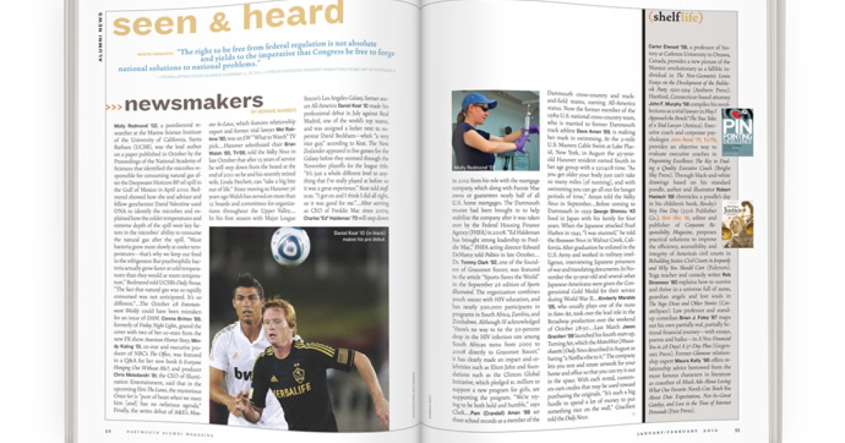 Molly Redmond ’02, a postdoctoral researcher at the Marine Science Institute of the University of California, Santa Barbara (UCSB), was the lead author on a paper published in October by the Proceedings of the National Academy of Sciences that identified the microbes responsible for consuming natural gas after the Deepwater Horizon BP oil spill in the Gulf of Mexico in April 2010. Redmond showed how she and advisor and fellow geochemist David Valentine used DNA to identify the microbes and explained how the colder temperatures and extreme depth of the spill were key factors in the microbes’ ability to consume the natural gas after the spill. “Most bacteria grow more slowly at cooler temperatures—that’s why we keep our food in the refrigerator. But psychrophilic bacteria actually grow faster at cold temperatures than they would at room temperature,” Redmond told UCSB’s Daily Nexus. “The fact that natural gas was so rapidly consumed was not anticipated. It’s so different.”